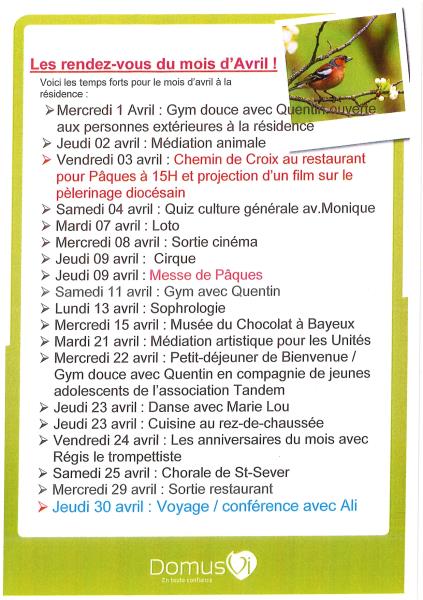 Programme du mois d'Avril